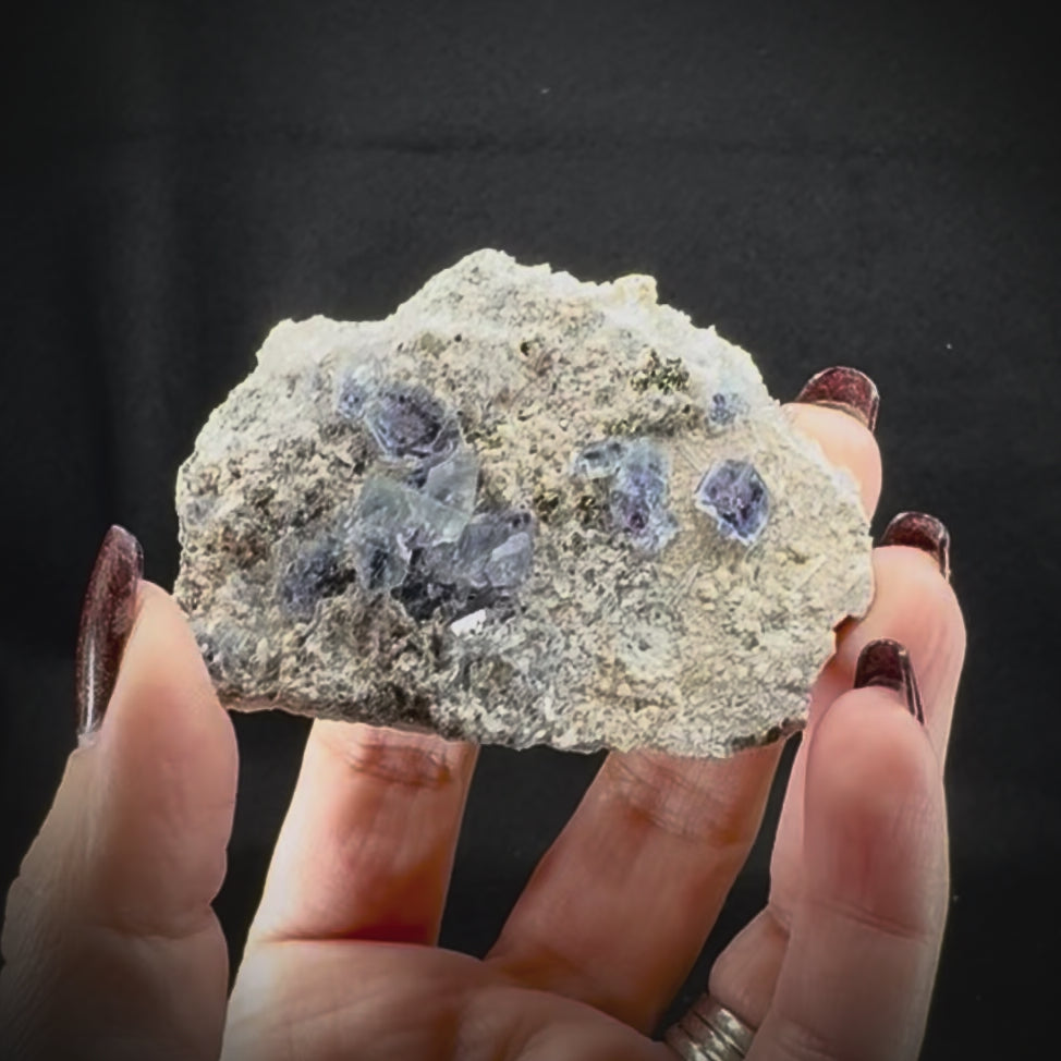 These highly variable pieces contain Fluorite crystal clusters within different matrixes, including feldspar, fine quartz crystals, botryoidal quartz, and other materials all originating from the Yindu Mine in Inner Mongolia, China. No two are alike, and each has its own unique distinct character.