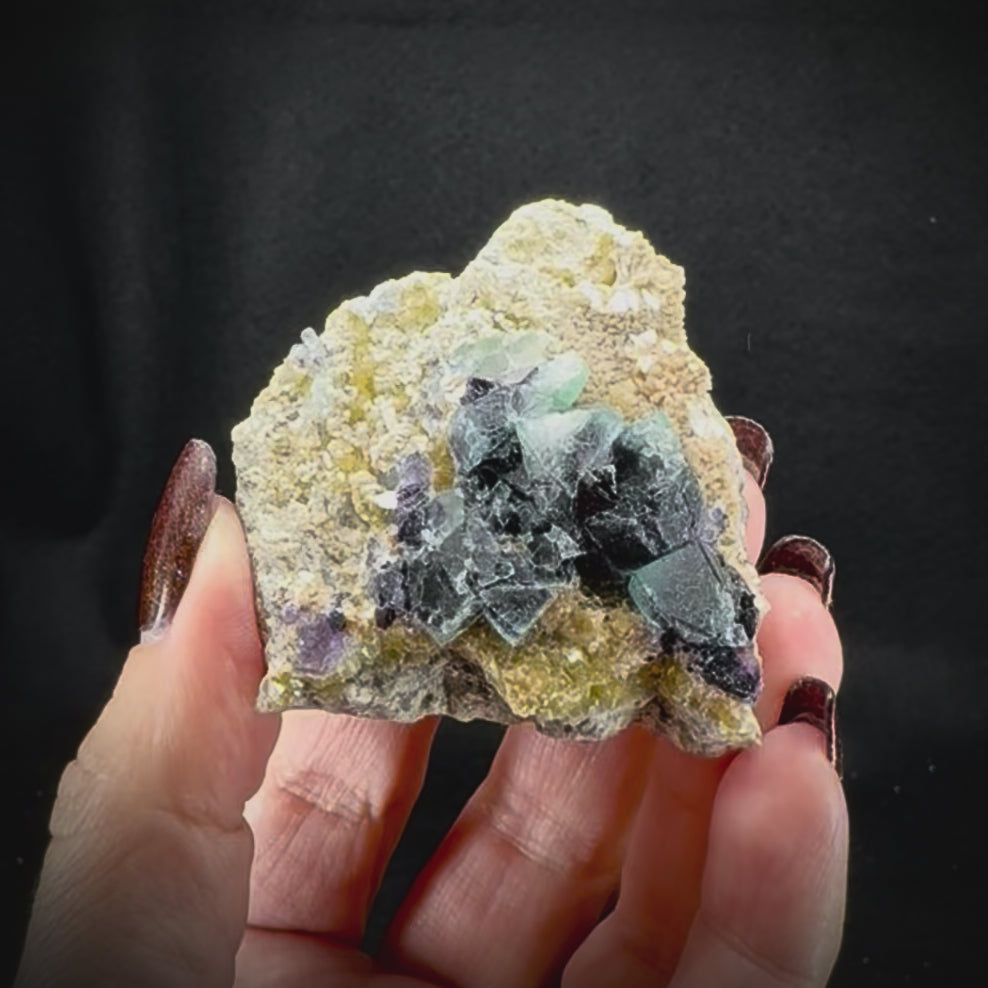 These highly variable pieces contain Fluorite crystal clusters within different matrixes, including feldspar, fine quartz crystals, botryoidal quartz, and other materials all originating from the Yindu Mine in Inner Mongolia, China. No two are alike, and each has its own unique distinct character.