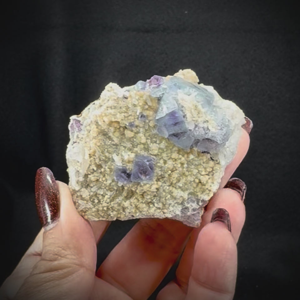 These highly variable pieces contain Fluorite crystal clusters within different matrixes, including feldspar, fine quartz crystals, botryoidal quartz, and other materials all originating from the Yindu Mine in Inner Mongolia, China. No two are alike, and each has its own unique distinct character.