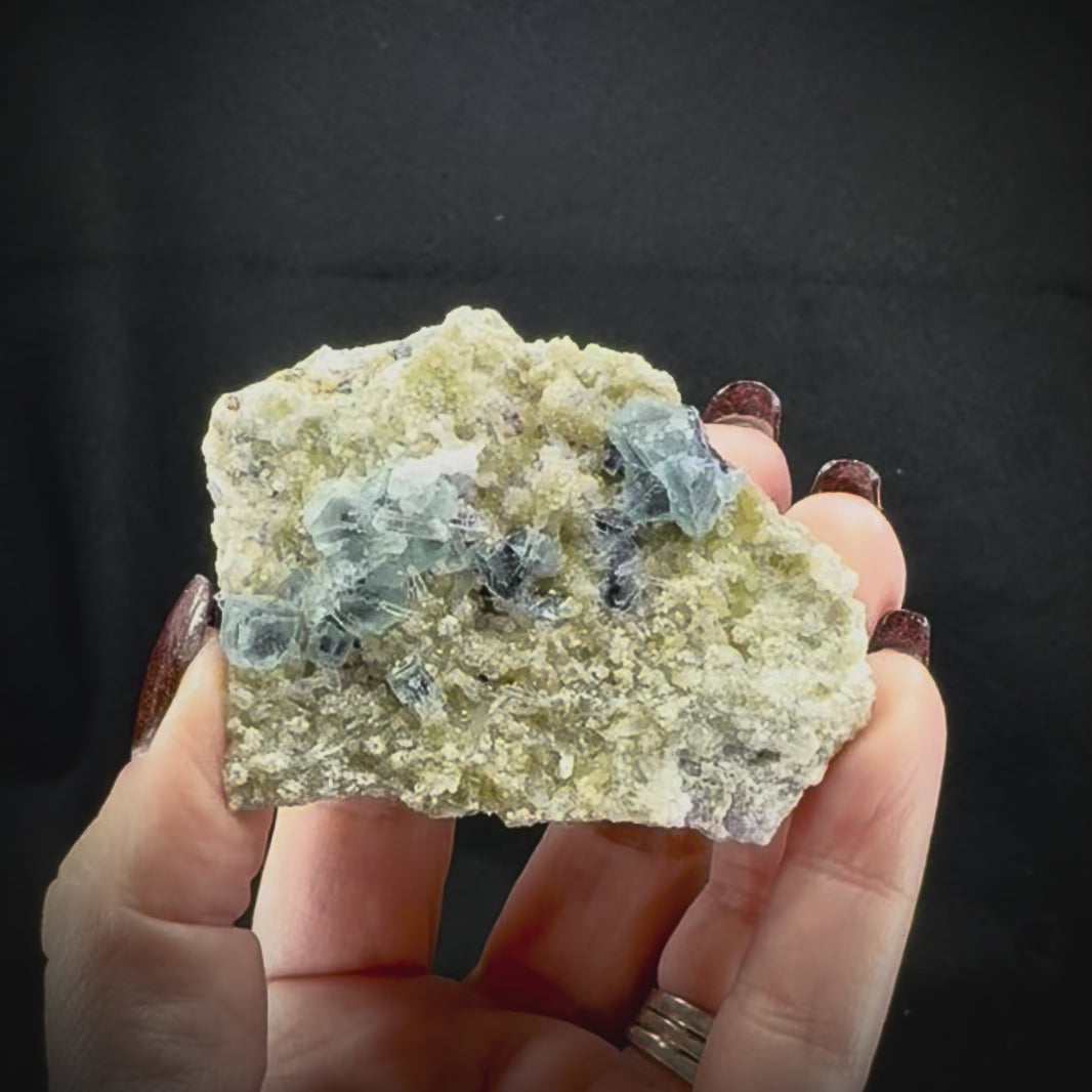 These highly variable pieces contain Fluorite crystal clusters within different matrixes, including feldspar, fine quartz crystals, botryoidal quartz, and other materials all originating from the Yindu Mine in Inner Mongolia, China. No two are alike, and each has its own unique distinct character.