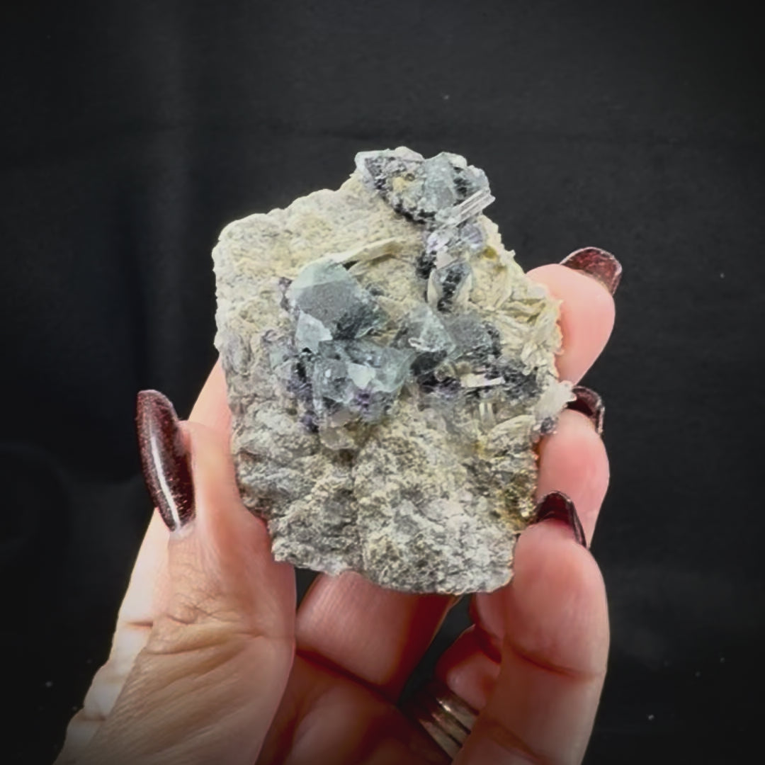 These highly variable pieces contain Fluorite crystal clusters within different matrixes, including feldspar, fine quartz crystals, botryoidal quartz, and other materials all originating from the Yindu Mine in Inner Mongolia, China. No two are alike, and each has its own unique distinct character.