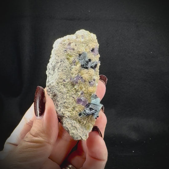 These highly variable pieces contain Fluorite crystal clusters within different matrixes, including feldspar, fine quartz crystals, botryoidal quartz, and other materials all originating from the Yindu Mine in Inner Mongolia, China. No two are alike, and each has its own unique distinct character.