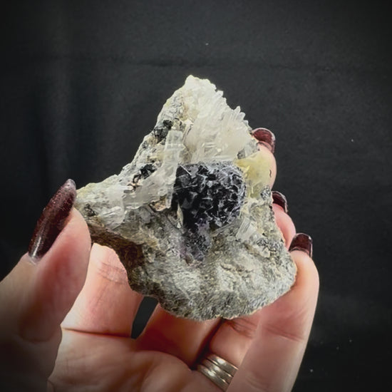 These highly variable pieces contain Fluorite crystal clusters within different matrixes, including feldspar, fine quartz crystals, botryoidal quartz, and other materials all originating from the Yindu Mine in Inner Mongolia, China. No two are alike, and each has its own unique distinct character.
