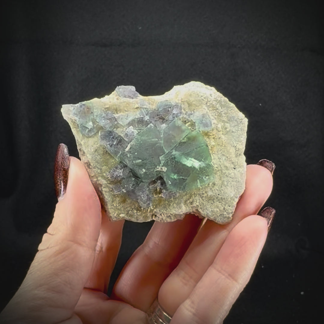 These highly variable pieces contain Fluorite crystal clusters within different matrixes, including feldspar, fine quartz crystals, botryoidal quartz, and other materials all originating from the Yindu Mine in Inner Mongolia, China. No two are alike, and each has its own unique distinct character.
