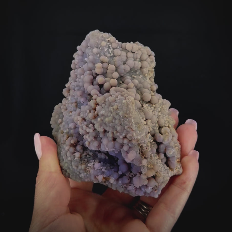 Grape Agate is a unique and distinctive mineral known from only a few locations on earth. Not technically an agate, it is instead formally known as botryoidal purple chalcedony. Named for the small spherical crystal nodules, these individual “grapes” can range in color from turquoise to deep purple, depending on the presence of minerals like manganese or iron during the formation of the crystals. Grape agate is a relatively new mineral and sought after by collectors due to its scarcity and vivid color.