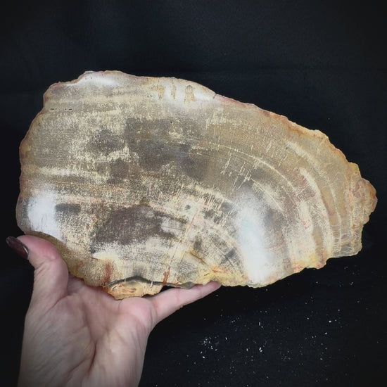 Perhaps the most well-known fossil material in the world, petrified wood is not wood at all but rather the fossilized remnants of trees from millions of years ago. Tree trunks, limbs, and branches that died under conditions that favor fossilization gradually become replaced with minerals until what remains is a replica of the original piece of wood consisting entirely of mineral material. Like the trees they capture the form of, each is unique and when cut vertically can reveal a cross section of the tree, sometimes including growth rings. Depending on the minerals present during fossilization, petrified wood can display an enormous variety of colors, textures and patterns. Each of these cut and polished slabs originates from Indonesia and is approximately 20-23 million years old.