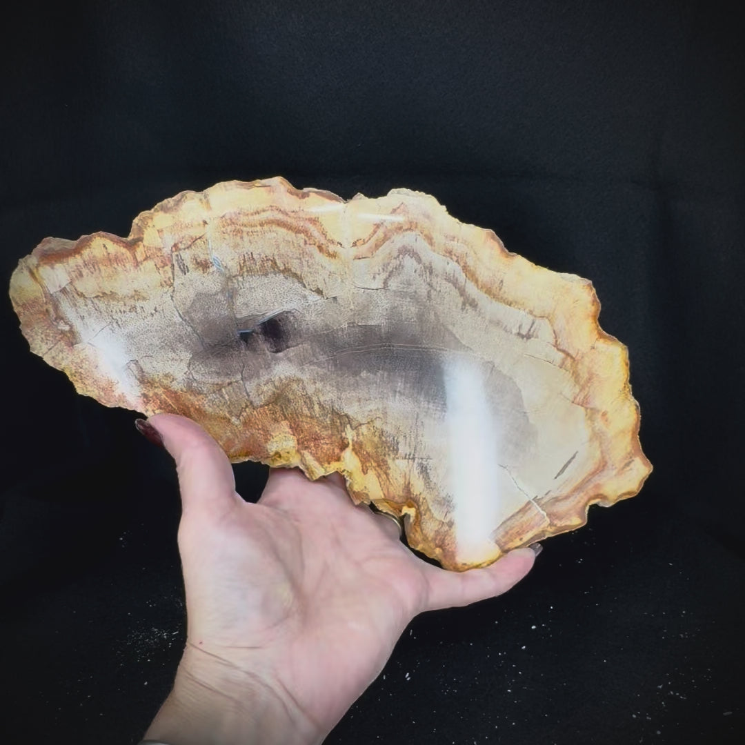 Perhaps the most well-known fossil material in the world, petrified wood is not wood at all but rather the fossilized remnants of trees from millions of years ago. Tree trunks, limbs, and branches that died under conditions that favor fossilization gradually become replaced with minerals until what remains is a replica of the original piece of wood consisting entirely of mineral material. Like the trees they capture the form of, each is unique and when cut vertically can reveal a cross section of the tree, sometimes including growth rings. Depending on the minerals present during fossilization, petrified wood can display an enormous variety of colors, textures and patterns. Each of these cut and polished slabs originates from Indonesia and is approximately 20-23 million years old.