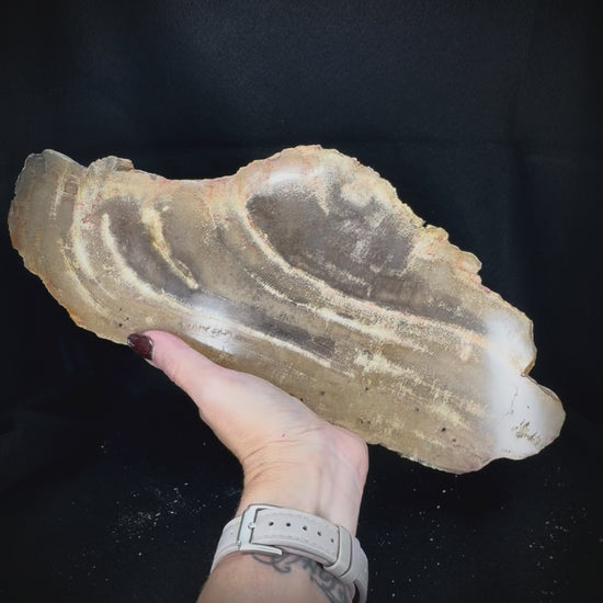 Perhaps the most well-known fossil material in the world, petrified wood is not wood at all but rather the fossilized remnants of trees from millions of years ago. Tree trunks, limbs, and branches that died under conditions that favor fossilization gradually become replaced with minerals until what remains is a replica of the original piece of wood consisting entirely of mineral material. Like the trees they capture the form of, each is unique and when cut vertically can reveal a cross section of the tree, sometimes including growth rings. Depending on the minerals present during fossilization, petrified wood can display an enormous variety of colors, textures and patterns. Each of these cut and polished slabs originates from Indonesia and is approximately 20-23 million years old.