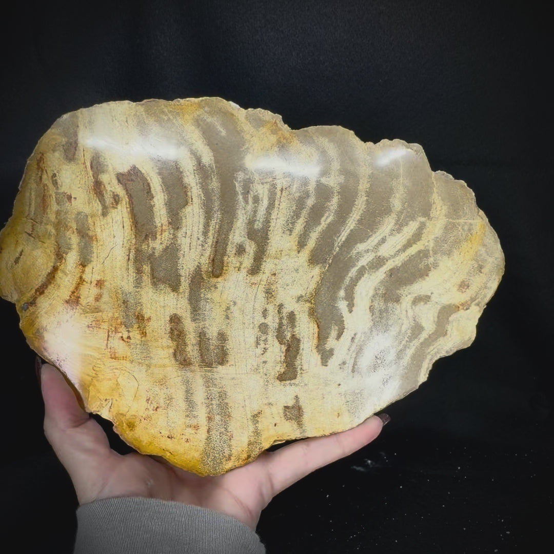 Perhaps the most well-known fossil material in the world, petrified wood is not wood at all but rather the fossilized remnants of trees from millions of years ago. Tree trunks, limbs, and branches that died under conditions that favor fossilization gradually become replaced with minerals until what remains is a replica of the original piece of wood consisting entirely of mineral material. Like the trees they capture the form of, each is unique and when cut vertically can reveal a cross section of the tree, sometimes including growth rings. Depending on the minerals present during fossilization, petrified wood can display an enormous variety of colors, textures and patterns. Each of these cut and polished slabs originates from Indonesia and is approximately 20-23 million years old.