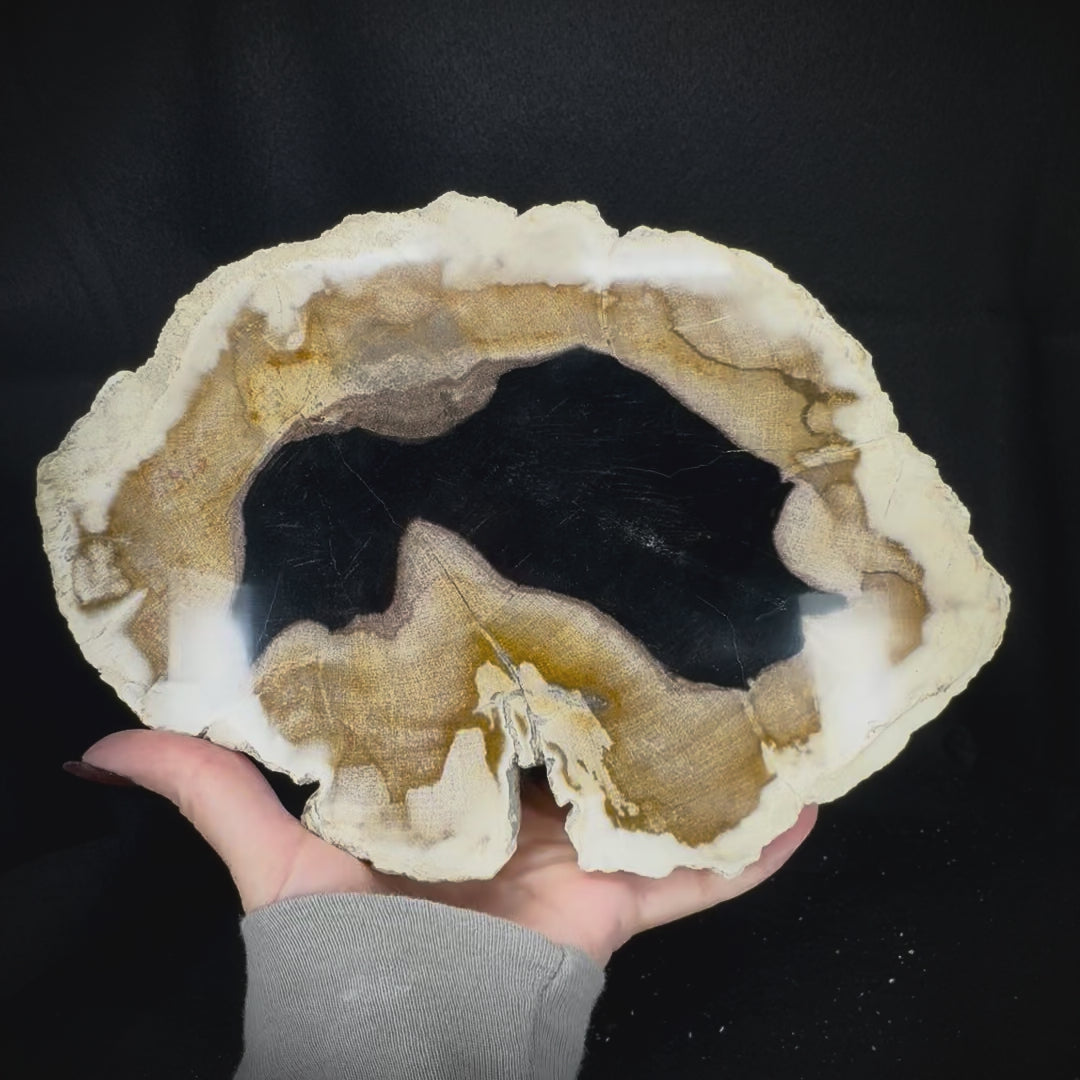 Perhaps the most well-known fossil material in the world, petrified wood is not wood at all but rather the fossilized remnants of trees from millions of years ago. Tree trunks, limbs, and branches that died under conditions that favor fossilization gradually become replaced with minerals until what remains is a replica of the original piece of wood consisting entirely of mineral material. Like the trees they capture the form of, each is unique and when cut vertically can reveal a cross section of the tree, sometimes including growth rings. Depending on the minerals present during fossilization, petrified wood can display an enormous variety of colors, textures and patterns. Each of these cut and polished slabs originates from Indonesia and is approximately 20-23 million years old.