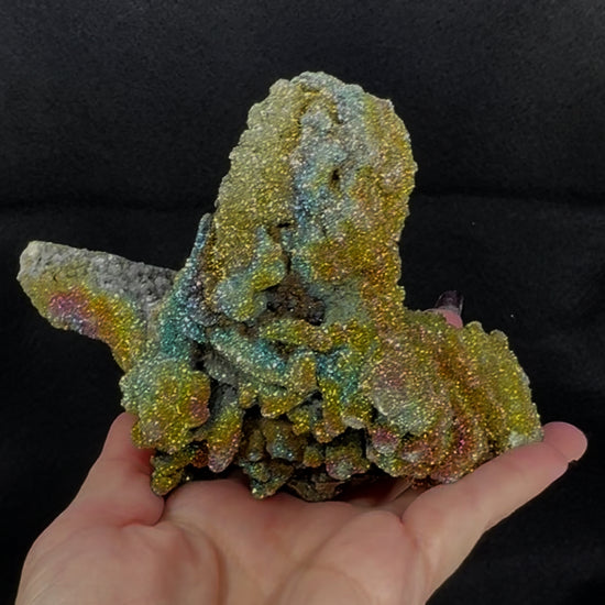 Rainbow or peacock pyrite is a much rarer form of pyrite named for the unmistakable and incredibly vibrant rainbow-colored iridescence it displays. The spectacular display of colors these specimens display can be formed by two different geological processes: the oxidation of pyrite causing ultra-thin layers of iron oxide to form on the surface, or the formation of equally thin layers of secondary minerals due to hydrothermal or other alteration. This naturally occurring form of relatively common pyrite remains highly sought after by collectors as a specimen or for use as a gem or in jewelry.