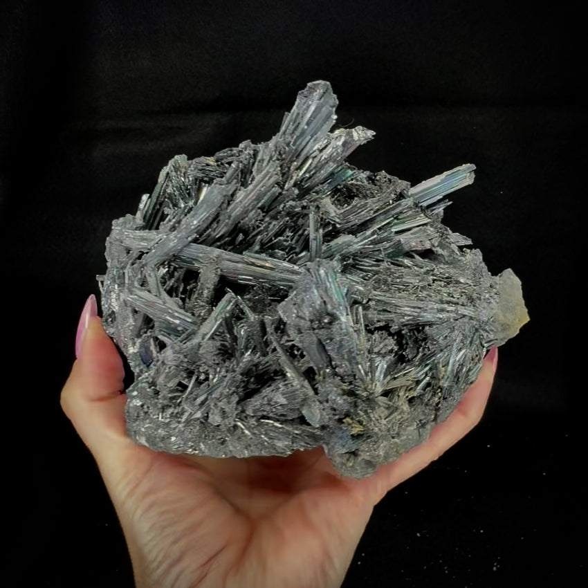Stibnite is a remarkable metallic mineral in the sulfide class that often forms impressive, delicate crystalline formations. Also known as antimonite, the mineral contains arsenic and silicate and historically has been used in pyrotechnics as well as a cosmetic since ancient Egyptian times until the safety issues with arsenic in makeup became known. As a mineral specimen stibnite crystals form intricate and almost otherworldly shapes, with a shiny multifaceted reflective surface that throws off a full prism of colors when in full light. Each of these large and completely unique formations from the famed Dachang Mine in China features incredible character and high metallic shine, exceptional collector's pieces.