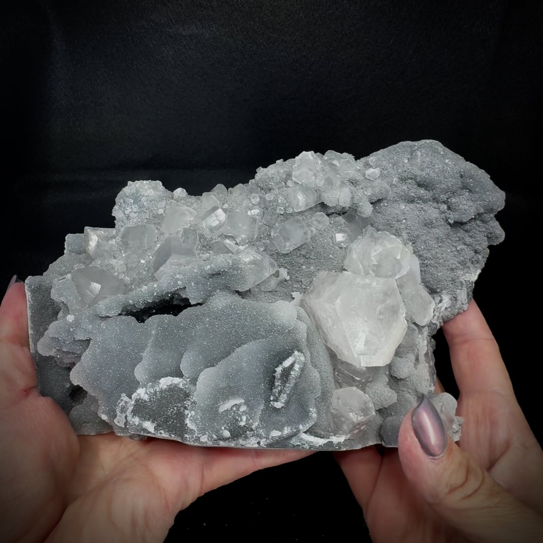 These large, showy specimens contain chunky calcite crystals of exceptional shape draped within a dazzling matrix of midnight blue to black fine sugar quartz. The unique dark sugar quartz matrix evokes interstellar scenes of distant star clusters and nebulae offsetting the brilliant shine of the calcite crystals it contains. Each formation is unique, with texture ranging from velvety and dark to rugose and sparkling, instantly eye catching and distinctive.