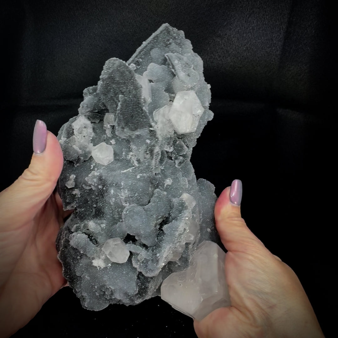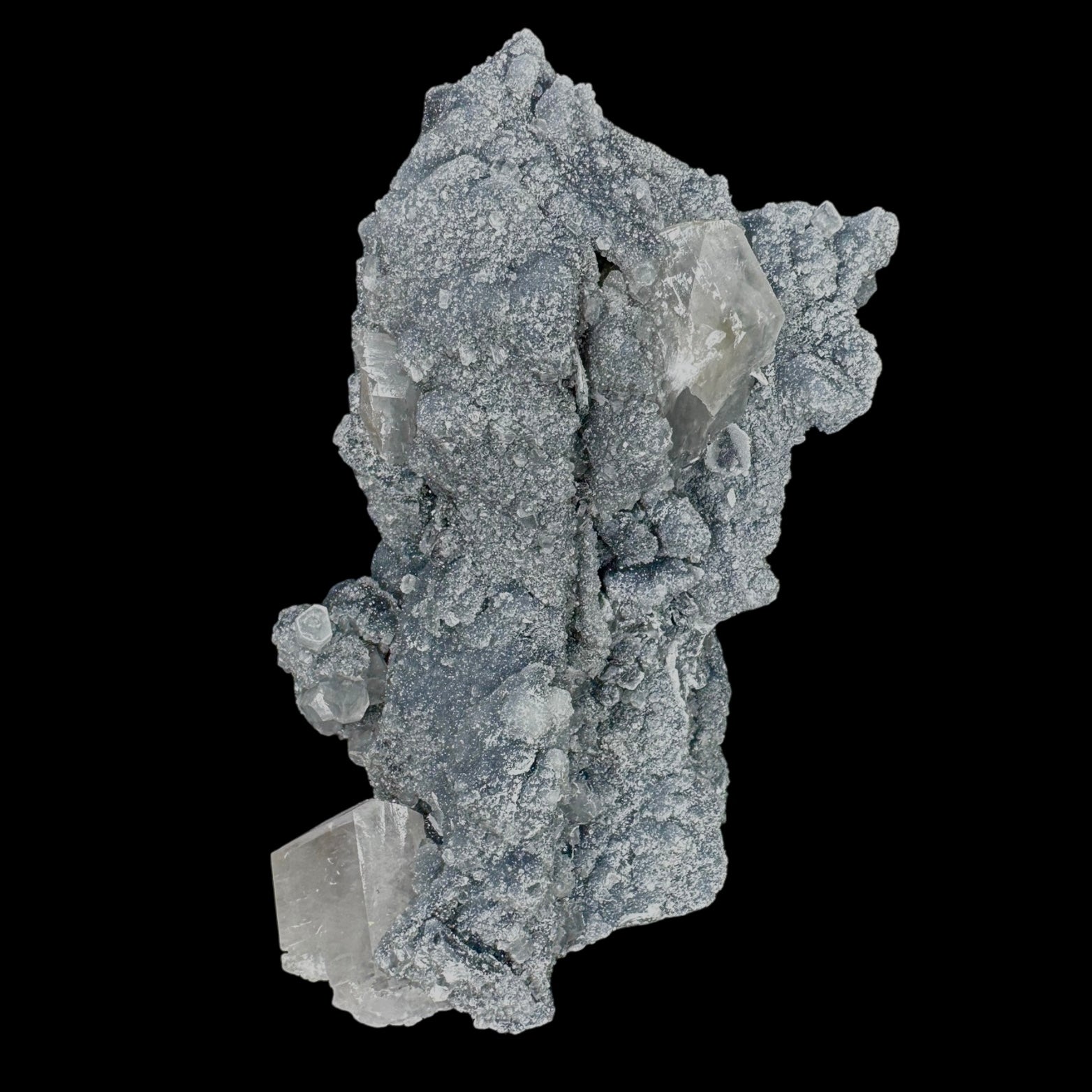 These large, showy specimens contain chunky calcite crystals of exceptional shape draped within a dazzling matrix of midnight blue to black fine sugar quartz. The unique dark sugar quartz matrix evokes interstellar scenes of distant star clusters and nebulae offsetting the brilliant shine of the calcite crystals it contains. Each formation is unique, with texture ranging from velvety and dark to rugose and sparkling, instantly eye catching and distinctive.