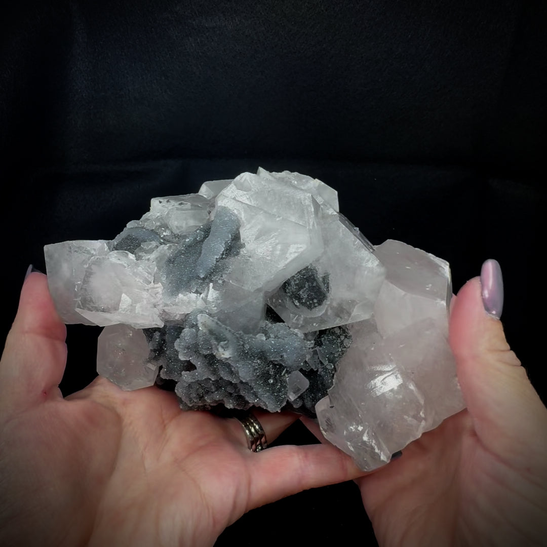 These large, showy specimens contain chunky calcite crystals of exceptional shape draped within a dazzling matrix of midnight blue to black fine sugar quartz. The unique dark sugar quartz matrix evokes interstellar scenes of distant star clusters and nebulae offsetting the brilliant shine of the calcite crystals it contains. Each formation is unique, with texture ranging from velvety and dark to rugose and sparkling, instantly eye catching and distinctive.