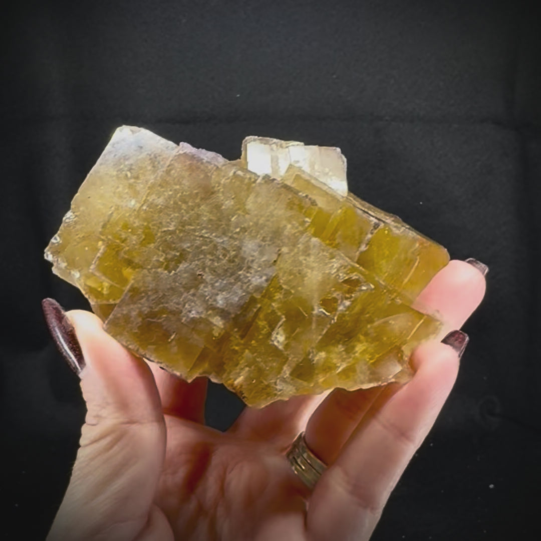 These remarkable yellow fluorite crystals originate from China and range in color from rich honey to pastel gold, some with highlights of purple or blue around the outer edges.