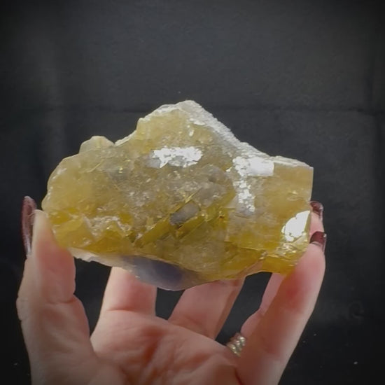 These remarkable yellow fluorite crystals originate from China and range in color from rich honey to pastel gold, some with highlights of purple or blue around the outer edges.