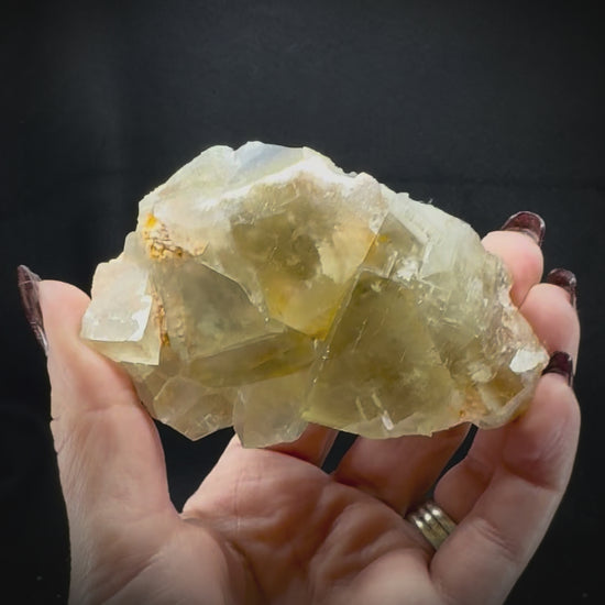 These remarkable yellow fluorite crystals originate from China and range in color from rich honey to pastel gold, some with highlights of purple or blue around the outer edges.